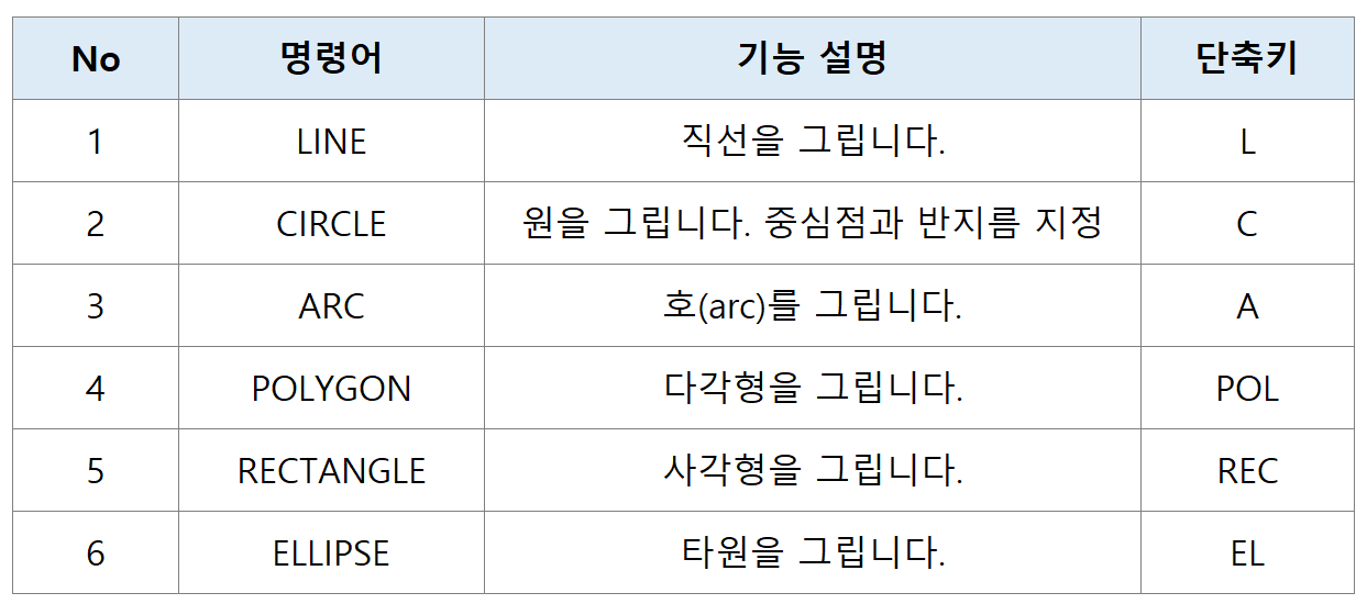 도면을 그릴 때 가장 많이 쓰는 명령어들입니다. 도형을 만들거나 선을 그릴 때 사용돼요.