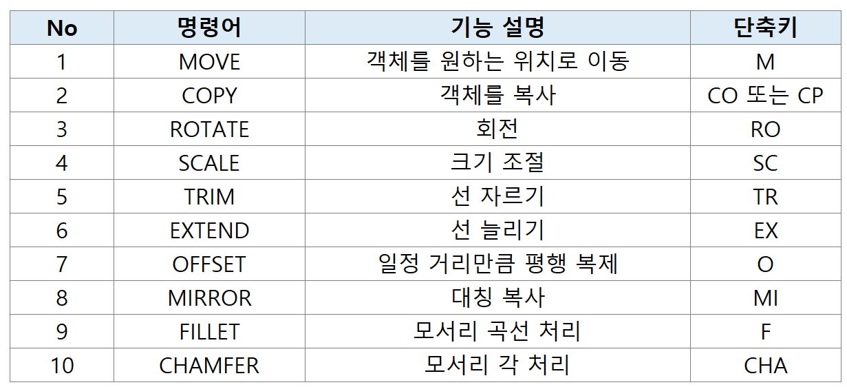 그려진 도형을 수정할 때 자주 사용하는 명령어들이에요. 도면을 깔끔하게 정리할 때 필수!