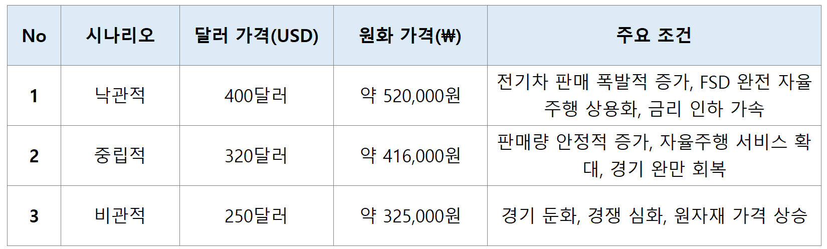 - 2025년 말 예상: 금리 인하 기대감 + 신차 출시로 300달러(약 40만 원) 부근 가능성